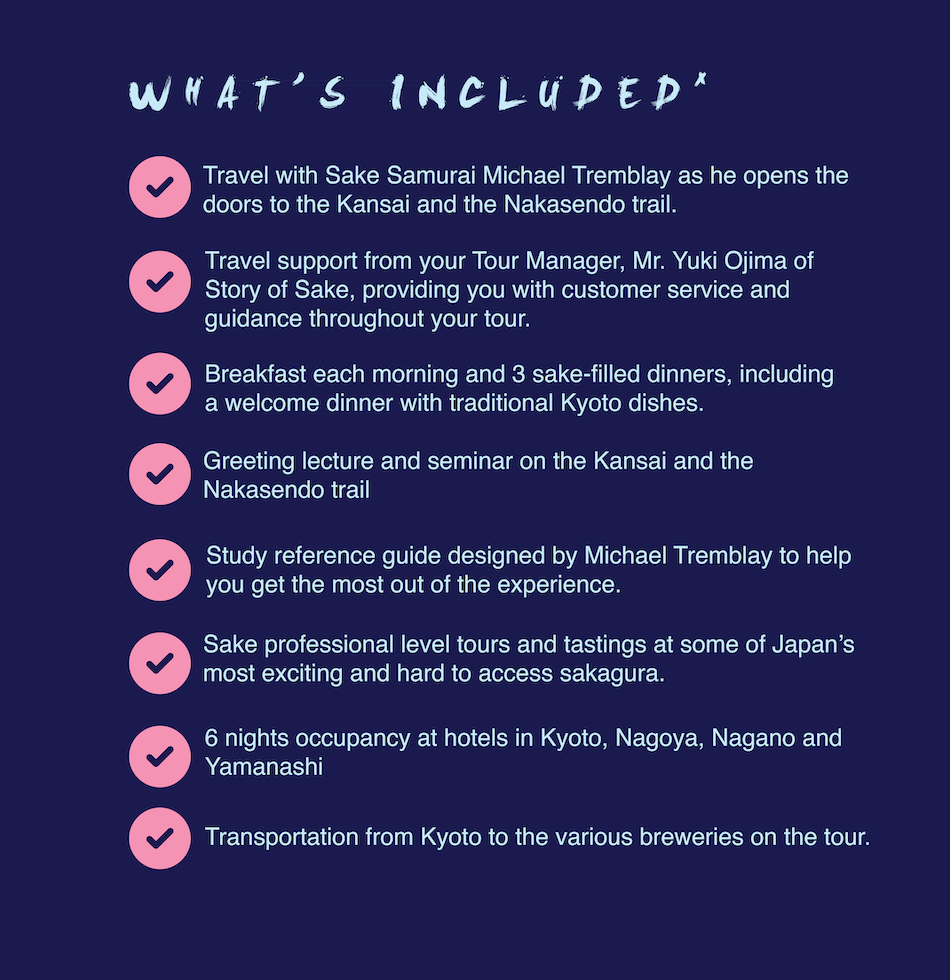 This Study Trip is an educational sake tour catering to Sake Scholar alumni who want to continue their sake adventures and amp up their sake knowledge. Guided by Sake Samurai Michael Tremblay, alumni will have the chance to thoroughly explore some of sake’s earliest beginnings in Nara, the idea of terroir (and whether it belongs) in Toku A rice Yamada Nishiki rice fields, and follow the ancient Nakasendo trail. Alumni will visit some of the most exciting sake breweries in Japan and be offered exclusive tastings of their celebrated sakes.
